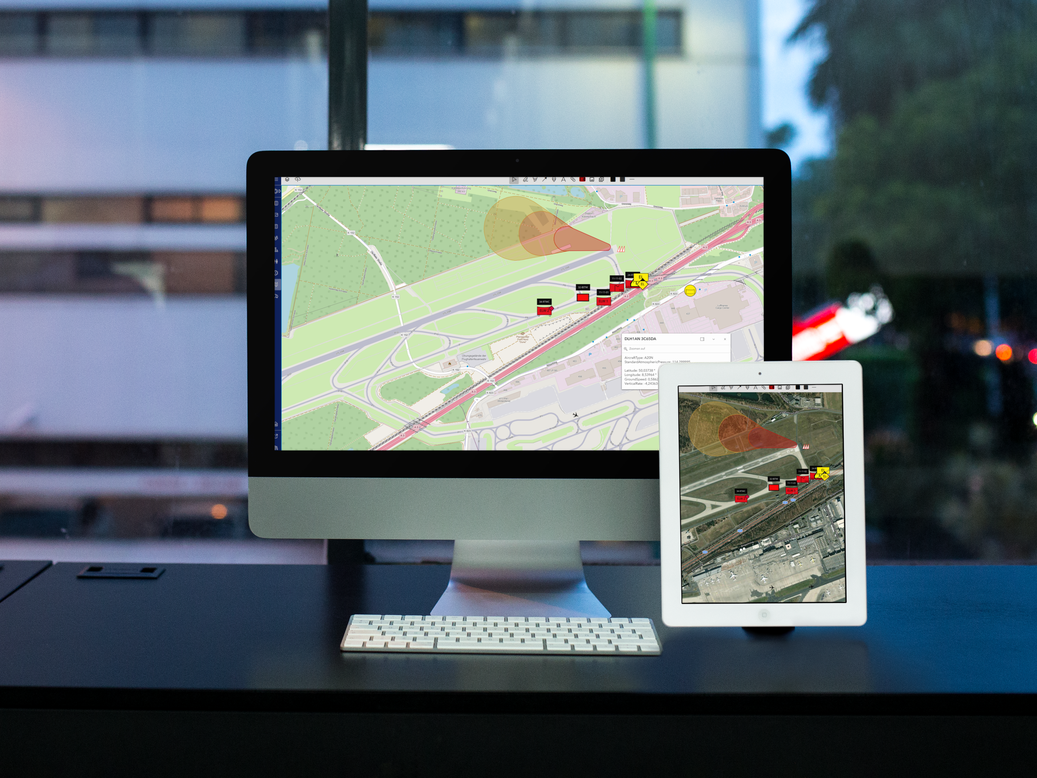 Flugobjekte werden mit Kennung, Position, Flughöhe und Bewegungsdaten präzise dargestellt.