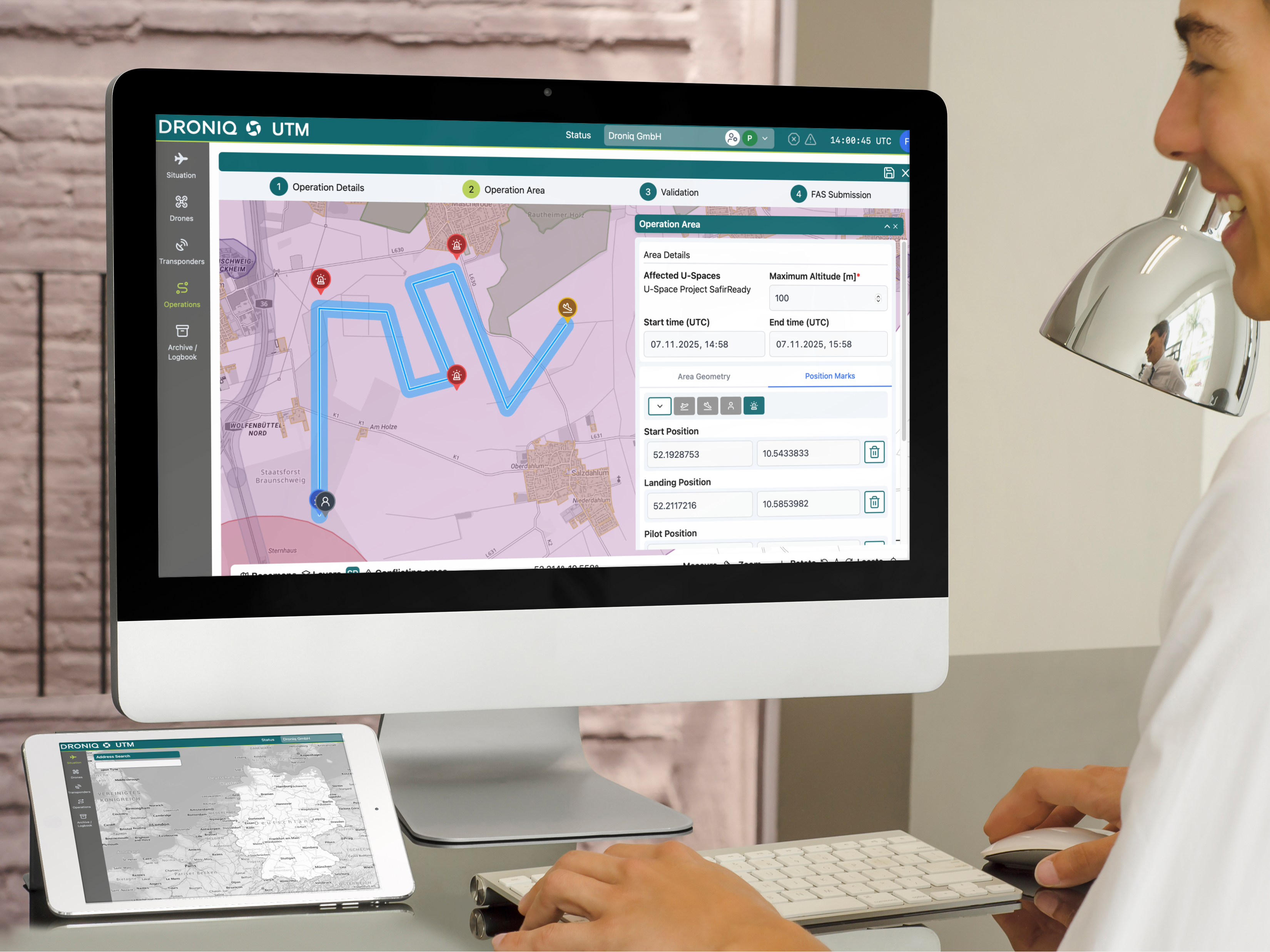 Mit dem UAS Traffic Management System (UTM) von Droniq lassen sich UAS sicher und effizient in den Luftraum integrieren. Das UTMagent unterstützt Behörden und Organisationen mit Sicherheitsaufgaben (BOS) bei der großflächigen Überwachung des bemannten und unbemannten Flugverkehrs innerhalb der Bundesrepublik Deutschlands.
